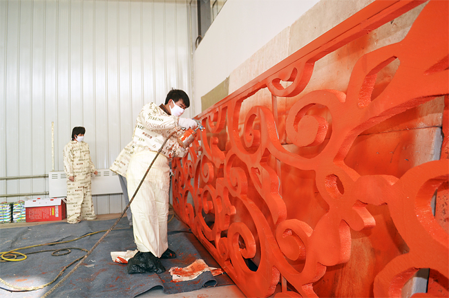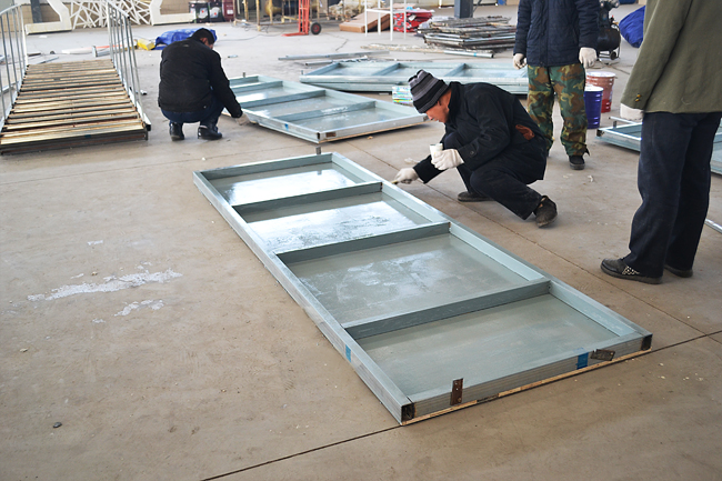 近日,中央電視臺《過年七天樂》節(jié)目錄制準(zhǔn)備工作緊張有序的進(jìn)行著。為減輕節(jié)目組的壓力,秦皇島康姿百德高新技術(shù)開發(fā)有限公司制造中心機(jī)修組主動承擔(dān)了舞臺背景的制作任務(wù)。 制造中心現(xiàn)場總指揮張振忠經(jīng)理介紹:“舞臺背景氣勢宏偉,運(yùn)用了燈籠、瓷器、木雕、中國結(jié)、山水畫、鏤空屏風(fēng)、青磚墻等豐富的中國文化元素進(jìn)行布局裝飾,工程量和工藝難度非產(chǎn)大。時間緊、任務(wù)重,要不打折扣的實(shí)現(xiàn)圖紙的設(shè)計風(fēng)格,我們的壓力山大啊”。 1500平方米的制造車間內(nèi),機(jī)器轟鳴、電焊火花四濺,一派繁忙景象。工人們手持電焊機(jī)、切割機(jī)、雕刻機(jī)、角磨機(jī)、電鉆、手提鋸、曲線鋸、自制刀剪等十八般武器,各顯神通。從28日晚上8點(diǎn)接到任務(wù)到31日晚8點(diǎn),制造中心的50多名工人每天都要忙碌到凌晨3點(diǎn)。 工作人員經(jīng)過三天奮戰(zhàn),于31日晚8點(diǎn)完成舞臺背景制作任務(wù),并于當(dāng)晚運(yùn)到《過年七天樂》錄制現(xiàn)場組裝。