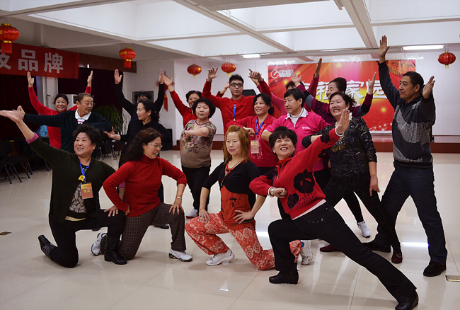 最早趕到康姿百德公司排練場(chǎng)地的是16位伴舞人員,都是50歲以上的中老年人。她們從早晨8點(diǎn)半開(kāi)始便投入了一遍又遍地排練。每排練一遍,舞蹈老師都會(huì)進(jìn)行細(xì)微的糾正、調(diào)整隊(duì)形和調(diào)動(dòng)情緒。每位健身操隊(duì)員也沒(méi)有因?yàn)榉磸?fù)的走位表現(xiàn)出疲憊或煩躁,始終面帶笑容,激情勃勃的投入排練。因?yàn)橥度氲倪\(yùn)動(dòng)量非常大,很多人都是滿頭大汗,演員們就索性脫下厚實(shí)的棉衣輕裝上陣。