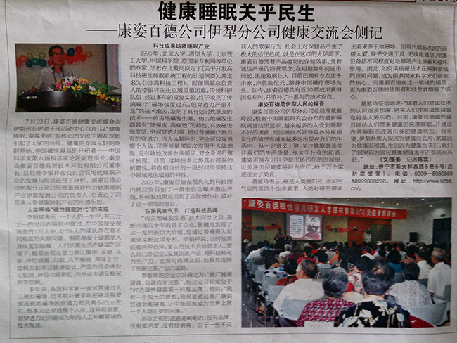 7月23日,康姿百德健康交流盛會在新疆伊犁州蘇伊老干部活動中心舉行,以“健康睡眠、幸福生活”為核心的交流主題引起了與會代表的共鳴。中國磁性寢具的開拓者—第六屆中國科學(xué)家論壇副理事長、秦皇島康姿百德高新技術(shù)開發(fā)有限公司董事長、總經(jīng)理李銀祥就健康睡眠產(chǎn)業(yè)的發(fā)展與現(xiàn)狀進行了深入分析。康姿百德公司伊犁分公司總經(jīng)理董雁玲向與會代表交流了從事健康睡眠產(chǎn)業(yè)四年來的所感所想。7月24日《伊犁晚報》對此次會議作了題為“健康睡眠、關(guān)乎民生”的專題報道。