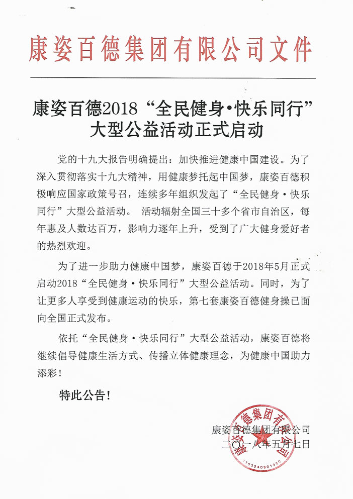 康姿百德2018“全民健身?快樂(lè)同行”大型公益活動(dòng)正式啟動(dòng),公告全文如下: