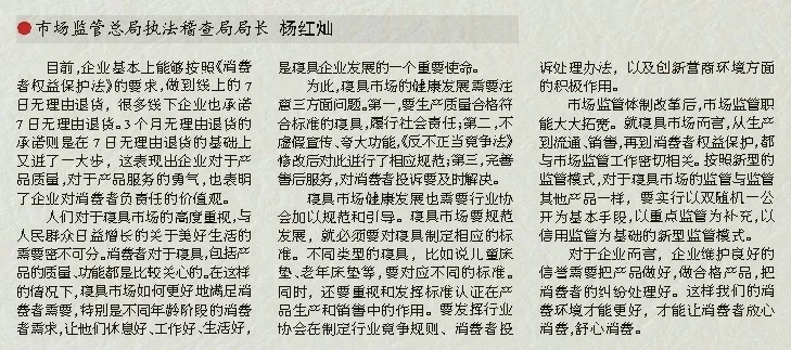 為此,寢具市場(chǎng)的健康發(fā)展需要注意三方面問題。第一,要生產(chǎn)質(zhì)量合格符合標(biāo)準(zhǔn)的寢具,履行社會(huì)責(zé)任;第二,不虛假宣傳、夸大功能,《反不正當(dāng)競(jìng)爭(zhēng)法》修改后對(duì)此進(jìn)行了相應(yīng)規(guī)范;第三,完善售后服務(wù),對(duì)消費(fèi)者投訴要及時(shí)解決。