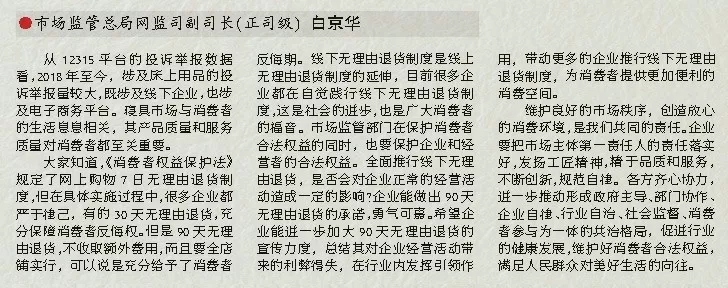大家知道,《消費(fèi)者權(quán)益保護(hù)法》規(guī)定了網(wǎng)上購物7日無理由退貨制度,但在具體實(shí)施過程中,很多企業(yè)都嚴(yán)于律己,有的30天無理由退貨,充分保障消費(fèi)者反悔權(quán)。但是90天無理由退貨,不收取額外費(fèi)用,而且要全店鋪實(shí)行,可以說是充分給予了消費(fèi)者反悔期。線下無理由退貨制度是線上無理由退貨制度的延伸,目前很多企業(yè)都在自覺踐行線下無理由退貨制度,這是社會(huì)的進(jìn)步,也是廣大消費(fèi)者的福音。市場(chǎng)監(jiān)管部門在保護(hù)消費(fèi)者合法權(quán)益的同時(shí),也要保護(hù)企業(yè)和經(jīng)營者的合法權(quán)益。全面推行線下無理由退貨,是否會(huì)對(duì)企業(yè)正常的經(jīng)營活動(dòng)造成一定的影響?企業(yè)能做出90天無理由退貨的承諾,勇氣可嘉。希望企業(yè)能進(jìn)一步加大90天無理由退貨的宣傳力度,總結(jié)其對(duì)企業(yè)經(jīng)營活動(dòng)帶來的利弊得失,在行業(yè)內(nèi)發(fā)揮引領(lǐng)作用,帶動(dòng)更多的企業(yè)推行線下無理由退貨制度,為消費(fèi)者提供更加便利的消費(fèi)空間。