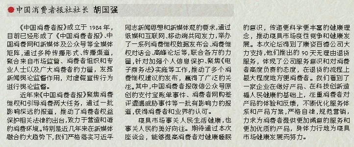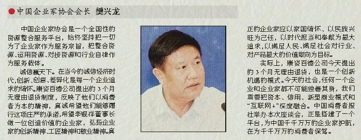 實(shí)際上,康姿百德公司今天提出的3個(gè)月無理由退貨,也是一個(gè)創(chuàng)新機(jī)遇的模式。今天的社會(huì),任何一個(gè)企業(yè)和企業(yè)家都不可能獨(dú)善其身,我們需要把資本、信用、新型商業(yè)模式和“互聯(lián)網(wǎng)+”深度融合。中國消費(fèi)者報(bào)社舉辦本次座談會(huì),正是搭建了一個(gè)平臺(tái),為中國千千萬萬的企業(yè)家護(hù)航,在為千千萬萬的消費(fèi)者保駕。