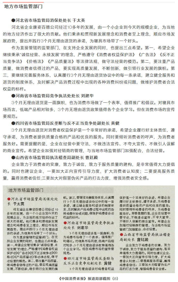 中國消費(fèi)者報(bào)訊 為構(gòu)建良好的消費(fèi)環(huán)境,規(guī)范寢具市場(chǎng)秩序,推動(dòng)寢具行業(yè)自律和健康發(fā)展,由中國消費(fèi)者報(bào)社主辦、康姿百德集團(tuán)有限公司協(xié)辦的“寢具市場(chǎng)秩序與消費(fèi)者權(quán)益保護(hù)”座談會(huì)于2019年5月28日在北京召開,來自國家市場(chǎng)監(jiān)督管理總局相關(guān)司局、中國企業(yè)家協(xié)會(huì)的相關(guān)領(lǐng)導(dǎo)、專家及寢具知名企業(yè)代表,圍繞消費(fèi)者權(quán)益保護(hù)、促進(jìn)寢具市場(chǎng)良性競(jìng)爭(zhēng)與規(guī)范發(fā)展等話題進(jìn)行了深入探討。本次座談會(huì)上,與會(huì)代表共同見證了康姿百德公司承諾“3個(gè)月無理由退貨”啟動(dòng)儀式。