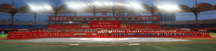 伴隨著優(yōu)美激昂的《走向復(fù)興》音樂,一幅寫有“讓科技造福生命”、面積為608平方米的巨型紅旗步入賽場??底税俚?1名工作人員共舉旗幟,整齊自如地緩緩前行,給人以極大的視覺沖擊!