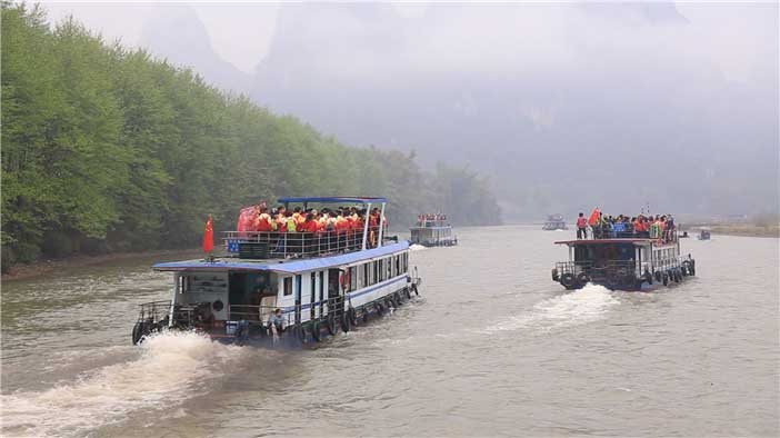 部分健身愛(ài)好者在漓江上乘船觀看風(fēng)景