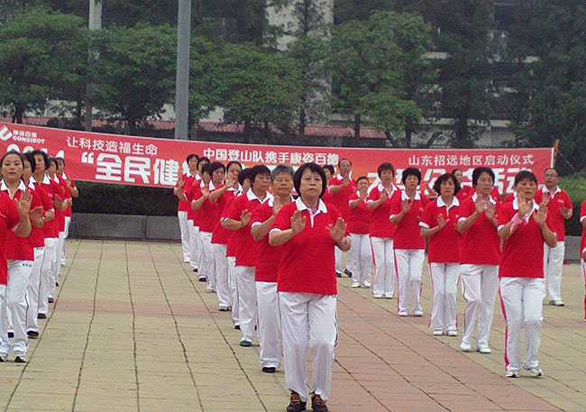 8月8日,山東招遠(yuǎn)的700多名康姿百德健身操愛(ài)好者和當(dāng)?shù)厥忻瘢谑姓畯V場(chǎng)載歌載舞,喜迎“全民健身日”,向人們倡導(dǎo)康姿百德公司提出的“健康睡眠+適量運(yùn)動(dòng)+合理飲食”的立體健康理念,傳遞著健康向上的正能量。 當(dāng)天上午8:30分,由當(dāng)?shù)乜底税俚聭?hù)外健身營(yíng)組織舉辦的2014“全民健身 快樂(lè)同行”大型公益活動(dòng)招遠(yuǎn)地區(qū)啟動(dòng)儀式在這里隆重舉行,招遠(yuǎn)經(jīng)銷(xiāo)商向廣大市民宣布了本次活動(dòng)的目的和意義,當(dāng)?shù)乜底税俚陆∩頎I(yíng)隊(duì)員進(jìn)行了健身操表演,贏得了在場(chǎng)觀眾的普遍贊賞。大家一致認(rèn)為,康姿百德健身操節(jié)拍有力,動(dòng)作到位,音樂(lè)優(yōu)美,具有適宜人群廣泛、簡(jiǎn)單易學(xué)的特點(diǎn),是市民健身鍛煉的好項(xiàng)目,今后要加入到這個(gè)健身隊(duì)伍中,為推廣全民健身貢獻(xiàn)力量。 本次活動(dòng)得到了當(dāng)?shù)赜嘘P(guān)部門(mén)和媒體的重視,招遠(yuǎn)市老體協(xié)等單位領(lǐng)導(dǎo)出席了啟動(dòng)儀式,招遠(yuǎn)新聞對(duì)本次活動(dòng)進(jìn)行了報(bào)道。