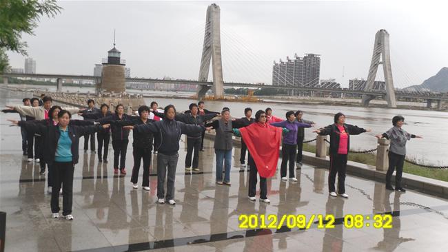 2012年9月12日,天空下著蒙蒙細(xì)雨,在遼寧朝陽(yáng)大凌河畔照例響起了動(dòng)感的音樂(lè),伴隨著節(jié)奏,有這樣一群中老年人,時(shí)而胳膊上揚(yáng),時(shí)而屈腿下蹲,時(shí)而左右擺動(dòng),時(shí)而前后擊掌……他們?cè)诟墒裁矗肯掠晏觳皇菓?yīng)該躲在家里看看電視、搓搓麻將、打打撲克嗎?為什么他們卻冒雨在明快節(jié)奏中舞動(dòng)……