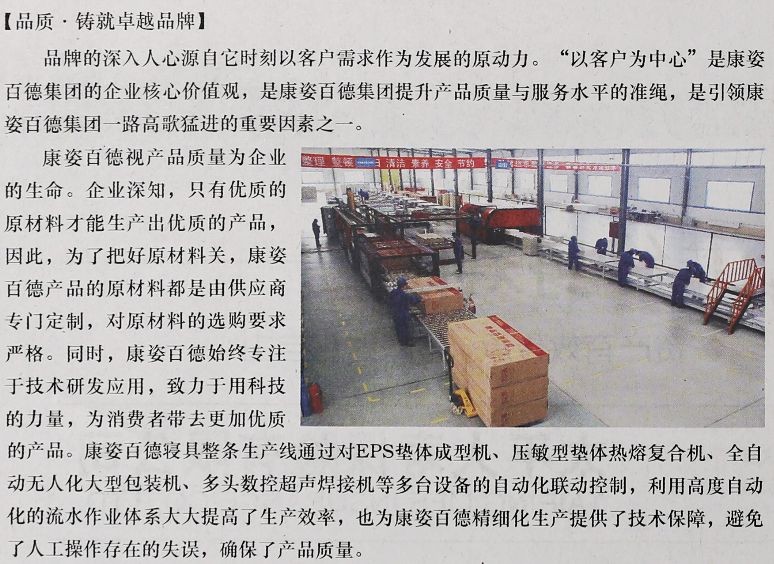 康姿百德視產(chǎn)品質(zhì)量為企業(yè)的生命。企業(yè)深知,只有優(yōu)質(zhì)的原材料才能生產(chǎn)出優(yōu)質(zhì)的產(chǎn)品,因此,為了把好原材料關(guān),康姿百德產(chǎn)品的原材料都是由供應商專門定制,對原材料的選購要求嚴格。同時,康姿百德始終專注于技術(shù)研發(fā)應用,致力于用科技的力量,為消費者帶去更加優(yōu)質(zhì)的產(chǎn)品??底税俚聦嬀哒麠l生產(chǎn)線通過對EPS墊體成型機、壓敏型墊體熱熔復合機、全自動無人化大型包裝機、多頭數(shù)控超聲焊接機等多臺設備的自動化聯(lián)動控制,利用高度自動化的流水作業(yè)體系大大提高了生產(chǎn)效率,也為康姿百德精細化生產(chǎn)提供了技術(shù)保障,避免了人工操作存在的失誤,確保了產(chǎn)品質(zhì)量。