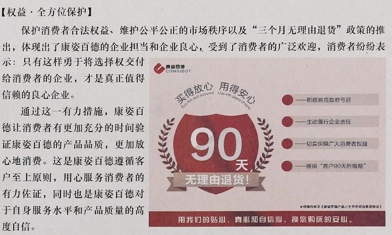 【權(quán)益·全方位保護】保護消費者合法權(quán)益、維護公平公正的市場秩序以及“三個月無理由退貨”政策的推出,體現(xiàn)出了康姿百德的企業(yè)擔當和企業(yè)良心,受到了消費者的廣泛歡迎,消費者紛紛表示:只有這樣勇于將選擇權(quán)交付給消費者的企業(yè),才是真正值得信賴的良心企業(yè)。