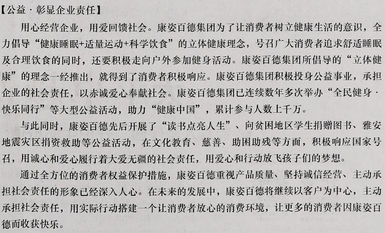【公益·彰顯企業(yè)責任】用心經(jīng)營企業(yè),用愛回饋社會??底税俚录瘓F為了讓消費者樹立健康生活的意識,全力倡導“健康睡眠+適量運動+科學飲食”的立體健康理念,號召廣大消費者追求舒適睡眠及合理飲食的同時,還要積極走向戶外參加健身活動。康姿百德集團所倡導的“立體健康”的理念一經(jīng)推出,就得到了消費者積極響應。康姿百德集團積極投身公益事業(yè),承擔企業(yè)的社會責任,以赤誠愛心奉獻社會。