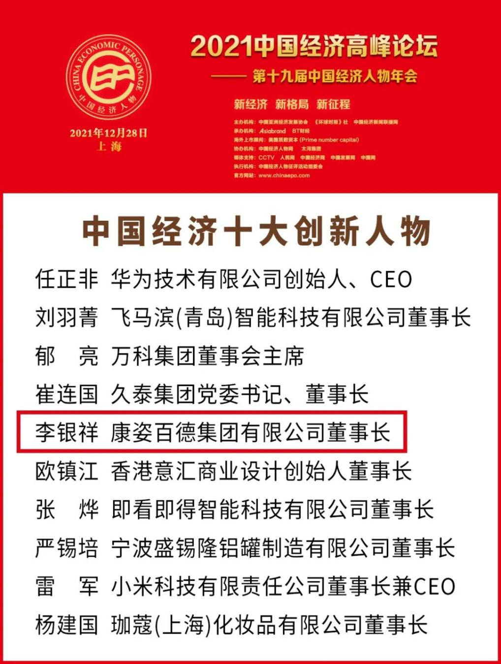 2021年12月28日,“2021中國(guó)經(jīng)濟(jì)高峰論壇暨第十九屆中國(guó)經(jīng)濟(jì)人物年會(huì)” 在上海成功舉行。本次活動(dòng)由中國(guó)經(jīng)濟(jì)新聞聯(lián)播網(wǎng)、《環(huán)球時(shí)報(bào)》社、中國(guó)亞洲經(jīng)濟(jì)發(fā)展協(xié)會(huì)聯(lián)合主辦。康姿百德集團(tuán)董事長(zhǎng)李銀祥榮獲“中國(guó)經(jīng)濟(jì)十大創(chuàng)新人物”榮譽(yù)稱號(hào)。