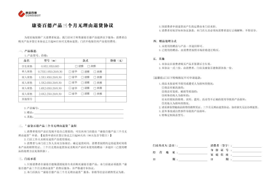 所謂“三個月無理由退貨”,就是在消費(fèi)者購買產(chǎn)品后的90天內(nèi),只要想辦理退貨,不需要任何理由和原因,都可以隨時要求退貨,而且不用支付產(chǎn)品使用費(fèi)、運(yùn)輸費(fèi)、拆包安裝費(fèi)。顧客購買產(chǎn)品時,我們都會與其簽訂《三個月無理由退貨協(xié)議》?!叭齻€月無理由退貨”政策,賦予了消費(fèi)者充分的選擇權(quán)和后悔期,讓消費(fèi)者在選擇產(chǎn)品時更加放心,沒有后顧之憂,真正為消費(fèi)者營造一個安全放心的消費(fèi)環(huán)境。