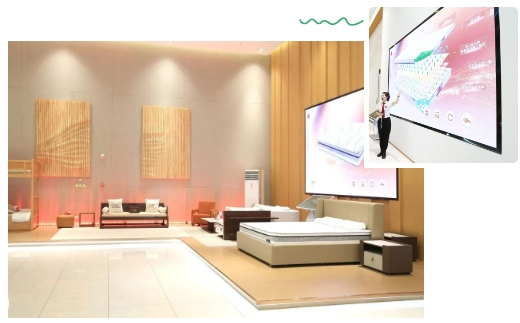 科技展廳安裝了智慧互動屏設(shè)備,上下兩個(gè)屏幕聯(lián)動,小屏控制大屏。用手操作觸控一體機(jī),可放大至穿透產(chǎn)品,實(shí)現(xiàn)康姿百德床墊的360°模型展示。全新的互動展示效果,讓參觀人員可以更直觀地了解康姿百德床墊的結(jié)構(gòu)。