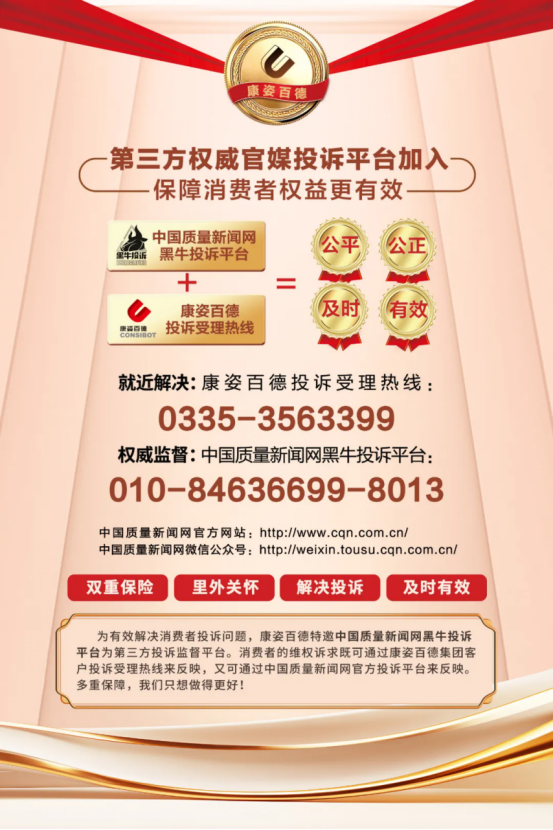 為了進一步提升專賣店的服務水平,更好地維護消費者的合法權益,康姿百德開通企業(yè)投訴受理熱線,加入了中國消費者協(xié)會“智慧315”消費維權投訴平臺,還特邀“中國質量新聞網(wǎng)黑牛投訴平臺”作為第三方投訴監(jiān)督平臺。并且,統(tǒng)一制作監(jiān)督舉報公示牌張貼在全國所有門店,主動接受消費者的監(jiān)督。多重途徑保障消費者的合法權益,真正做到投訴有渠道,事事有回音,件件有著落,讓廣大消費者購買無憂。
