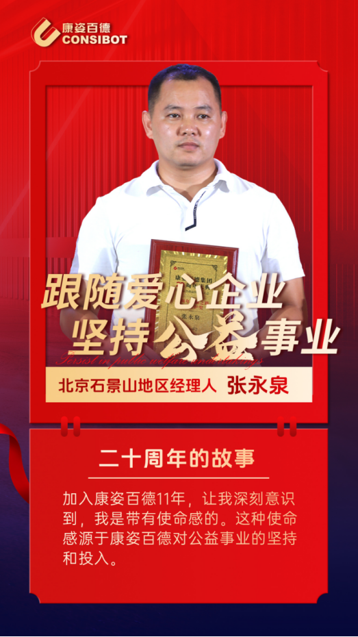 他常說(shuō)“成功的關(guān)鍵在于不斷沉淀與堅(jiān)持”。自加入康姿百德11年來(lái),他以飽滿的熱情和堅(jiān)韌不拔的毅力,不斷提升服務(wù)質(zhì)量,努力為客戶(hù)創(chuàng)造更大的價(jià)值。懷揣著對(duì)公益事業(yè)的熱情和無(wú)盡的動(dòng)力,堅(jiān)持公益,默默貢獻(xiàn)著自己的力量。他就是康姿百德北京石景山地區(qū)經(jīng)理人張永泉。