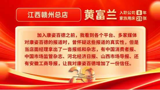 據(jù)黃富蘭回憶,在加入康姿百德時有一個小插曲?!爱敃r是想找份工作,正好看到康姿百德門店在招聘店員,走進去后店面經(jīng)理正給應聘者做企業(yè)介紹,還介紹到了多家媒體對康姿百德進行過報道。當時我看到各個平臺、多家媒體對康姿百德的報道時,曾懷疑這些報道的真實性,擔心是門店作假。店面經(jīng)理看出了我的顧慮,拿出了一沓報紙和雜志,有中國消費者報、中國市場監(jiān)管雜志、河北經(jīng)濟日報、山西市場導報、還有安徽工商導報,讓我對康姿百德增加了一份信任。”