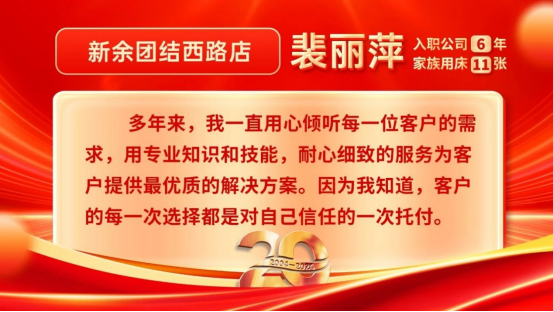 今年是康姿百德集團成立20周年。在20年的發(fā)展歷程中,有這樣一群人,他們在市場經(jīng)營管理過程中,深刻貫徹以客戶為中心的理念,始終把優(yōu)質(zhì)的服務融于門店經(jīng)營的每個環(huán)節(jié),也因此得到了客戶的贊賞和認可。他們就是康姿百德專賣店的員工。本期和您分享的是康姿百德江西地區(qū)專賣店員工代表的故事。