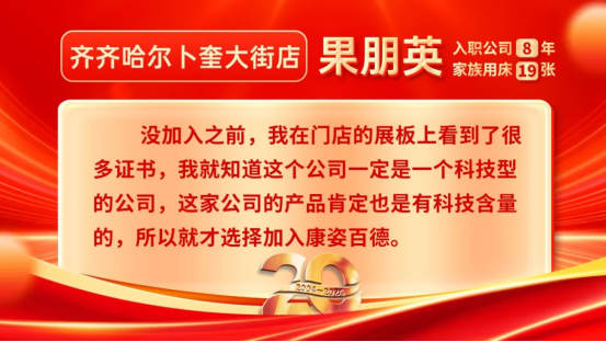 談到為什么加入康姿百德,果朋英說道:“沒加入之前,我在門店的展板上看到了很多證書,我就知道這個(gè)公司一定是一個(gè)科技型的公司,這家公司的產(chǎn)品肯定也是有科技含量的,所以就才選擇加入康姿百德?!?/span>