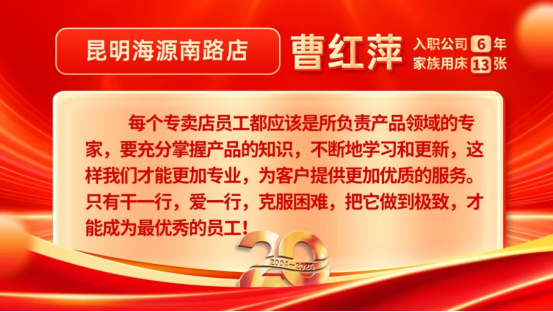 今年是康姿百德集團成立20周年。在20年的發(fā)展歷程中,有這樣一群人,他們在市場經營管理過程中,深刻貫徹以客戶為中心的理念,始終把優(yōu)質的服務融于門店經營的每個環(huán)節(jié),也因此得到了客戶的贊賞和認可。他們就是康姿百德專賣店的員工。本期和您分享的是康姿百德云南地區(qū)和廣東地區(qū)專賣店員工代表的故事。