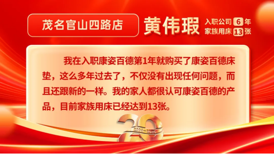 黃偉瑕說道:“我在入職康姿百德第1年就購買了康姿百德床墊,這么多年過去了,不僅沒有出現任何問題,而且還跟新的一樣。我的家人都很認可康姿百德的產品,目前家族用床已經達到13張。我目前最大的愿望就是要讓更多消費者知道康姿百德這個品牌,認可康姿百德,讓康姿百德成為廣東茂名地區(qū)有影響力的寢具品牌?!?/span>