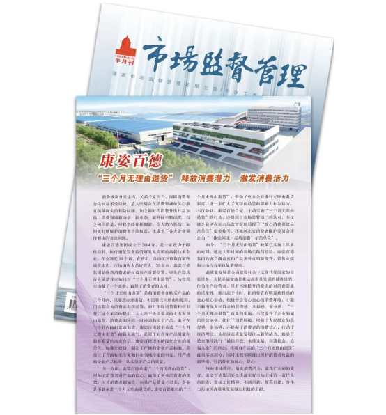 今年12月,《市場(chǎng)監(jiān)督管理》半月刊專(zhuān)題報(bào)道再次以《康姿百德“三個(gè)月無(wú)理由退貨”--釋放消費(fèi)潛力 激發(fā)消費(fèi)活力》為題,全面、詳細(xì)地報(bào)道了康姿百德?!妒袌?chǎng)監(jiān)督管理》半月刊對(duì)康姿百德的多次專(zhuān)題報(bào)道,是對(duì)康姿百德的認(rèn)可,也是激勵(lì)。康姿百德將一如既往地堅(jiān)持誠(chéng)信經(jīng)營(yíng),不斷提升產(chǎn)品和服務(wù)質(zhì)量,為寢具市場(chǎng)在保障消費(fèi)者權(quán)益方面做出表率,帶動(dòng)更多企業(yè)推行無(wú)理由退貨制度,為經(jīng)濟(jì)高質(zhì)量發(fā)展做出新的貢獻(xiàn)。